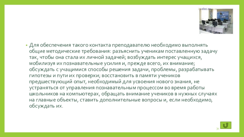 Слайд 34Для обеспечения такого контакта преподавателю необходимо выполнять общие методические требования: разъяснить