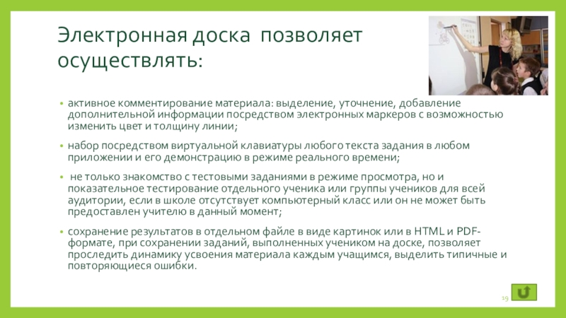 качествами традиционной школьной доски, имеет более широкие возможности графического комментирования экранных изображений; позволяет контролировать и производить мониторинг работы всех учеников класса одновременно; естественным образом (за счет увеличения потока предъявляемой информации) увеличить учебную нагрузку учащегося в классе; обеспечить эргономичность обучения; создавать новые мотивационные предпосылки к обучению; вести обучение, построенное на диалоге; обучать по интенсивным методикам с использованием кейс-методов.