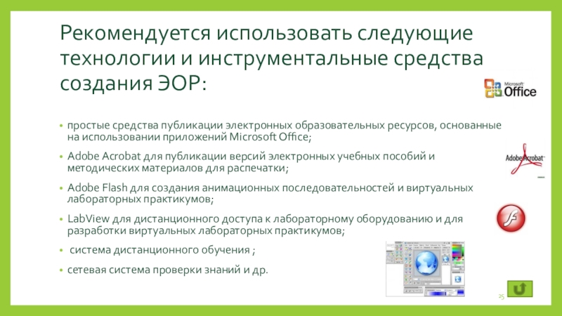 Слайд 25Рекомендуется использовать следующие технологии и инструментальные средства создания ЭОР:
