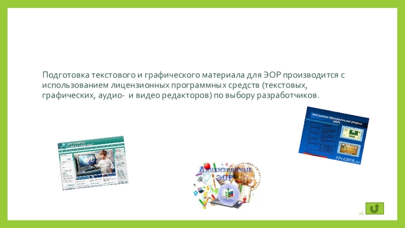 Слайд 26Подготовка текстового и графического материала для ЭОР производится с использованием лицензионных