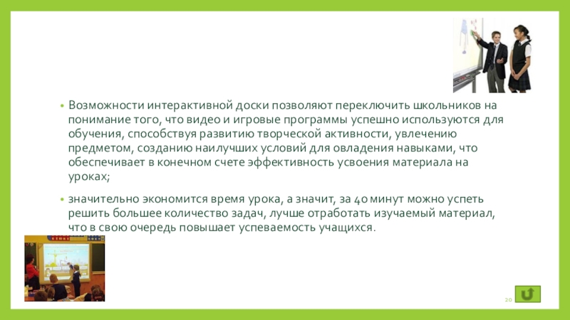 Слайд 20Возможности интерактивной доски позволяют переключить школьников на понимание того, что видео