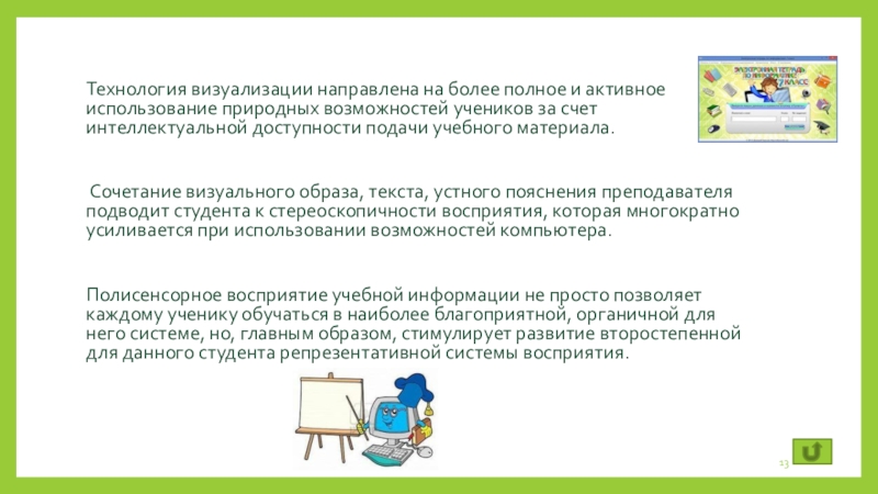 Слайд 13Технология визуализации направлена на более полное и активное использование природных возможностей