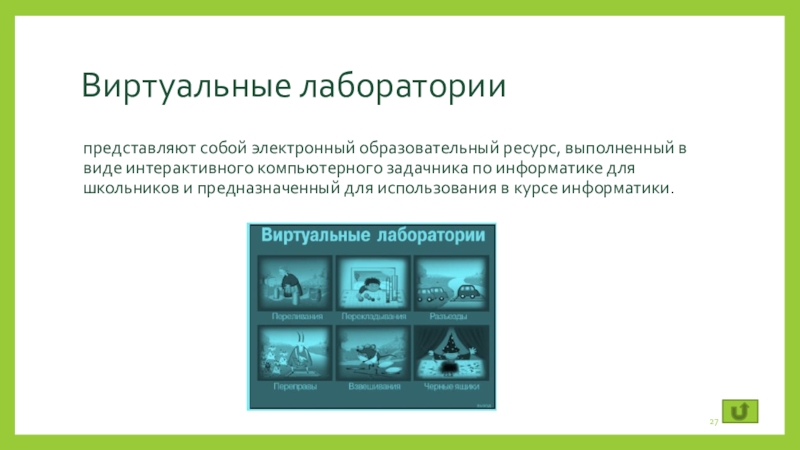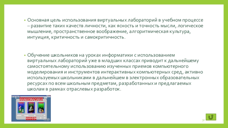 Слайд 32Основная цель использования виртуальных лабораторий в учебном процессе – развитие таких