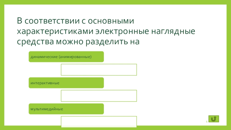 Слайд 6В соответствии с основными характеристиками электронные наглядные средства можно разделить на