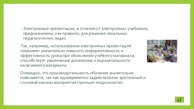 Слайд 16Электронные презентации, в отличие от электронных учебников, предназначены, как правило, для