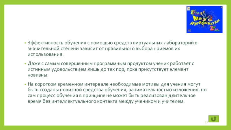 Слайд 33Эффективность обучения с помощью средств виртуальных лабораторий в значительной степени зависит