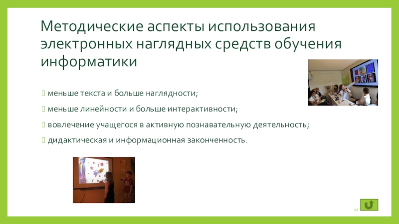 Слайд 21Методические аспекты использования электронных наглядных средств обучения информатики