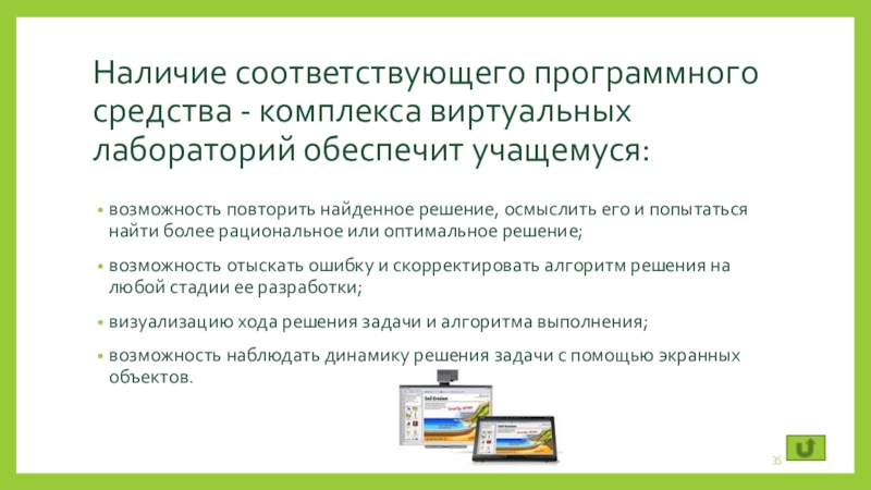 Слайд 35Наличие соответствующего программного средства - комплекса виртуальных лабораторий обеспечит учащемуся:
