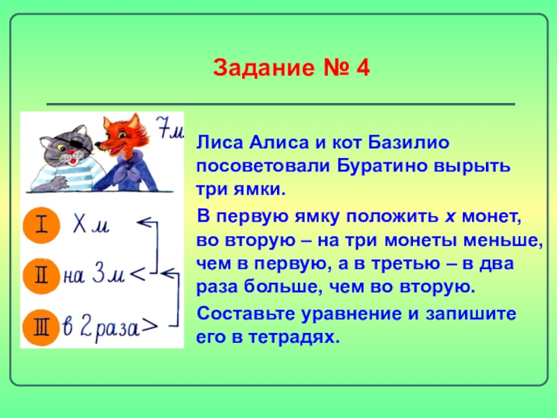 Задание № 4 Лиса Алиса и кот Базилио посоветовали Буратино вырыть три ямки. В первую ямку положить