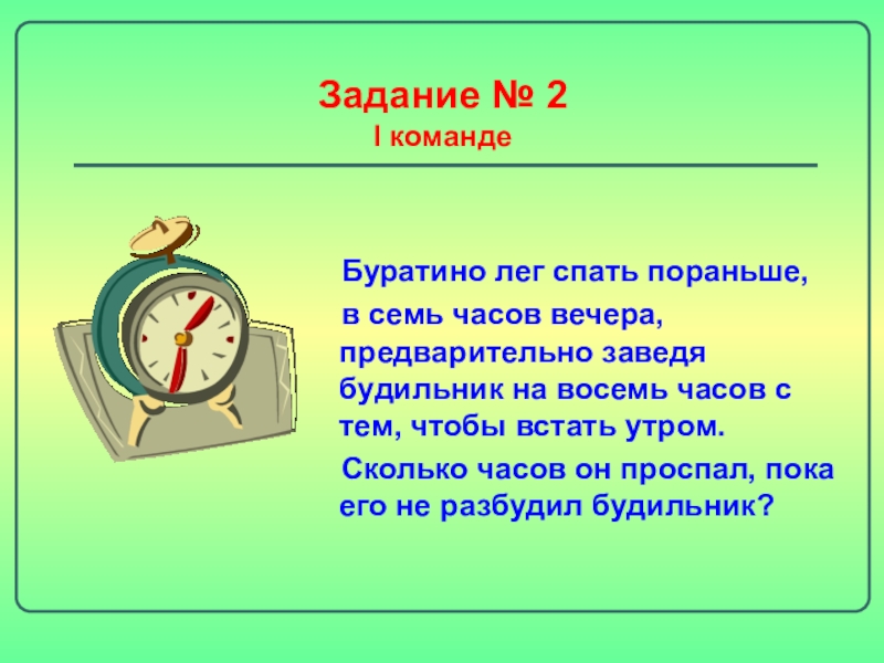 Задание № 2  I командеБуратино лег спать пораньше, в семь часов вечера, предварительно заведя будильник на