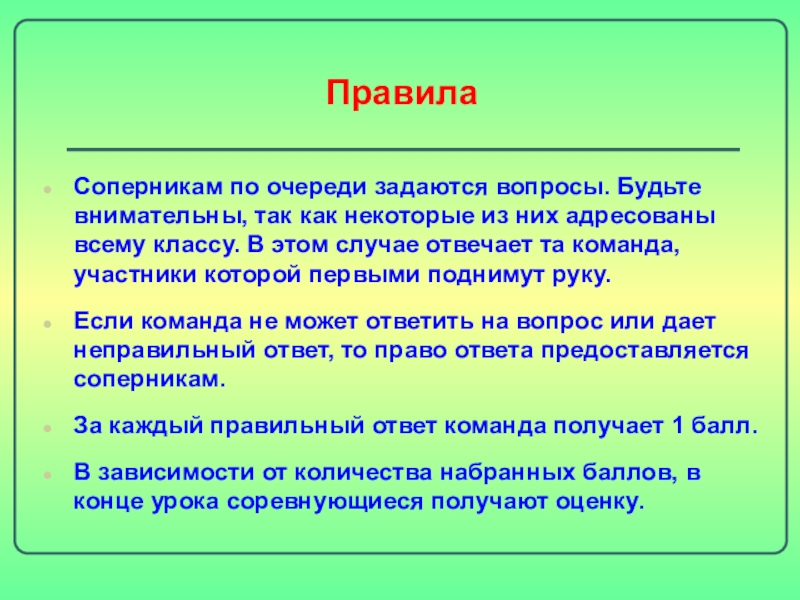 ПравилаСоперникам по очереди задаются вопросы. Будьте внимательны, так как некоторые из них адресованы всему классу. В этом случае отвечает та команда, участники которой первыми поднимут руку. Если команда не может ответить на вопрос или дает неправильный