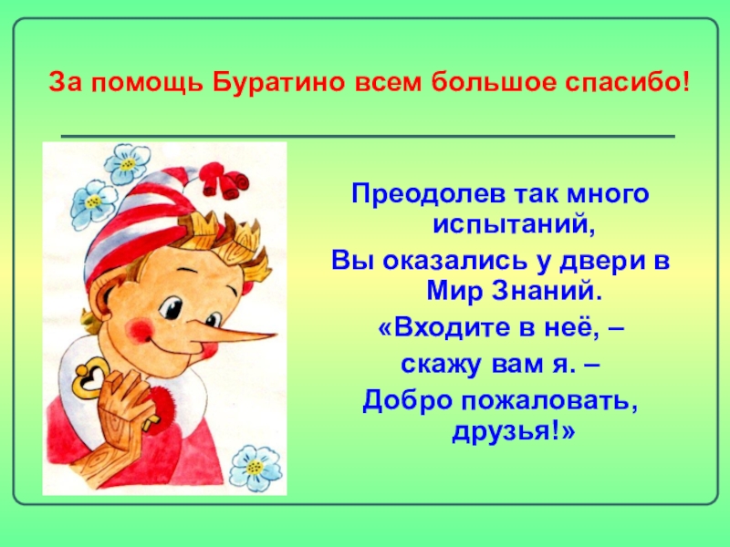 За помощь Буратино всем большое спасибо!Преодолев так много испытаний,Вы оказались у двери в Мир Знаний.«Входите в неё,