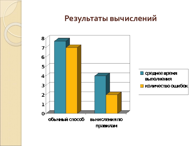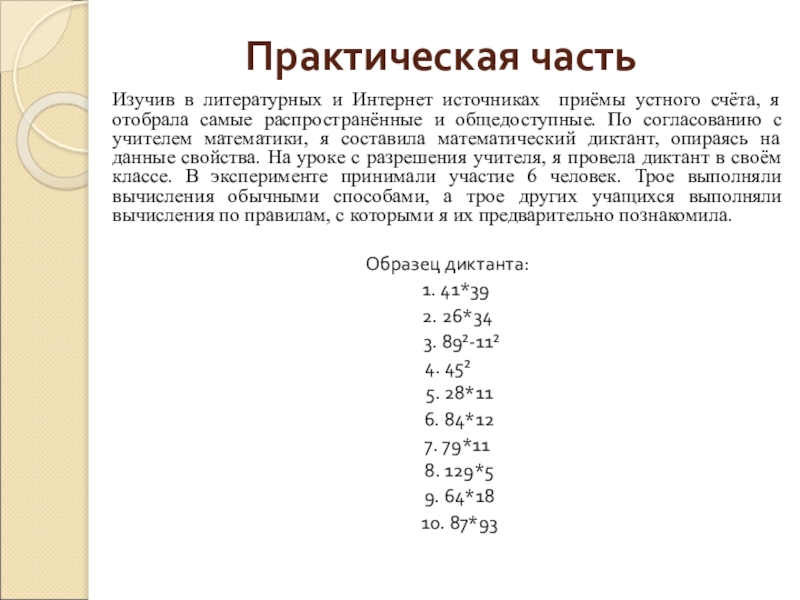 отобрала самые распространённые и общедоступные. По согласованию с учителем математики, я составила математический диктант, опираясь на данные свойства. На уроке с разрешения учителя, я провела диктант в своём классе. В эксперименте принимали участие 6 человек. Трое выполняли вычисления обычными способами, а трое других учащихся выполняли вычисления по правилам, с которыми я их предварительно познакомила.