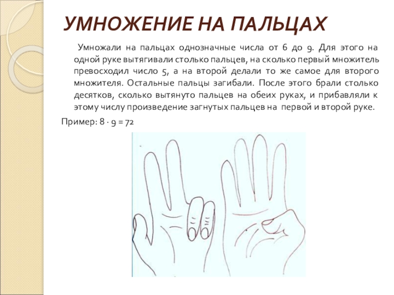 Для этого на одной руке вытягивали столько пальцев, на сколько первый множитель превосходил число 5, а на второй делали то же самое для второго множителя. Остальные пальцы загибали. После этого брали столько десятков, сколько вытянуто пальцев на обеих руках, и прибавляли к этому числу произведение загнутых пальцев на первой и второй руке.