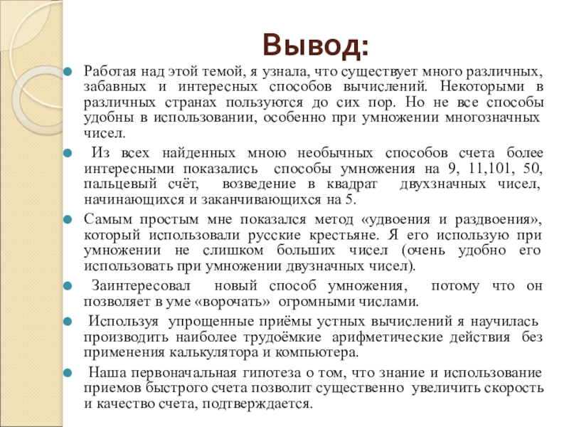 Используя упрощенные приёмы устных вычислений я научилась производить наиболее трудоёмкие арифметические действия без применения калькулятора и компьютера.