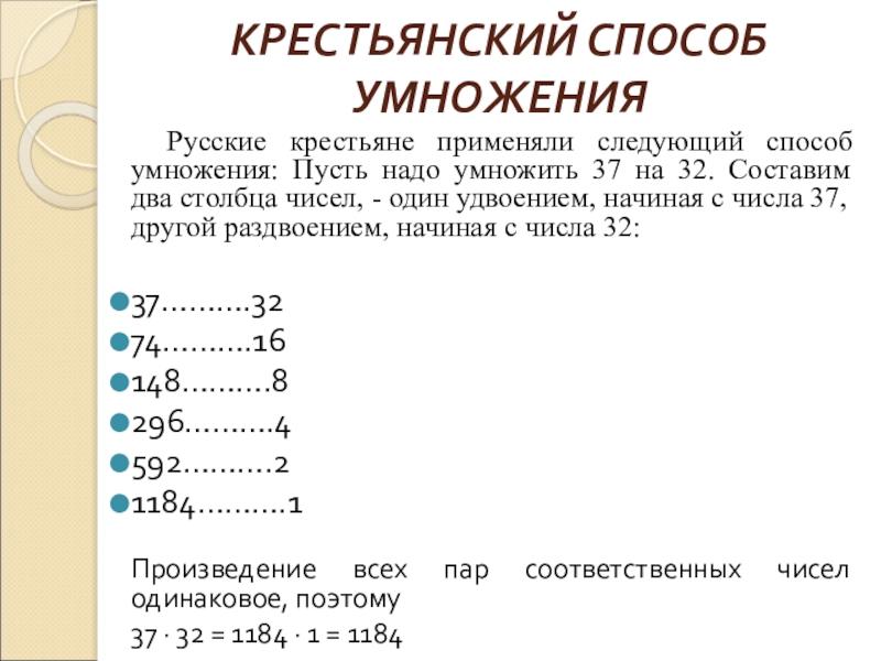 Русские крестьяне применяли следующий способ умножения: Пусть надо умножить