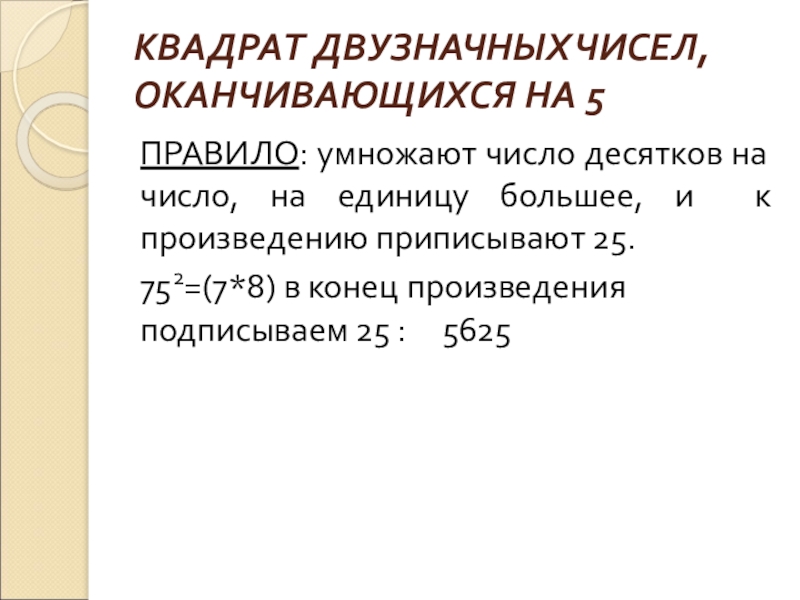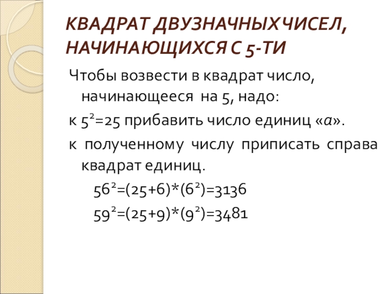 Квадрат двузначных чисел, начинающихся с 5-ти; квадрат двузначных чисел, оканчивающихся на 5