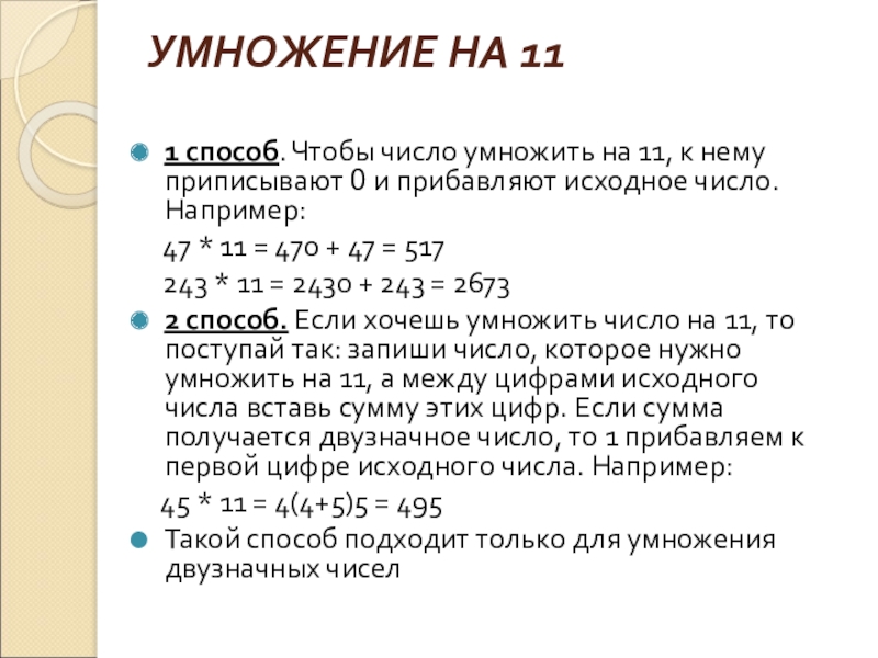 2 способ. Если хочешь умножить число на 11, то поступай так: запиши число, которое нужно умножить на 11, а между цифрами исходного числа вставь сумму этих цифр. Если сумма получается двузначное число, то 1 прибавляем к первой цифре исходного числа. Например: