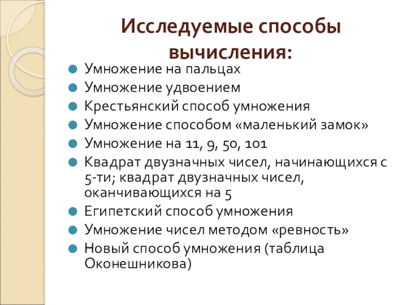 Из всех найденных мною необычных способов счета более интересными показались способы умножения на 9, 11,101, 50, пальцевый счёт, возведение в квадрат двухзначных чисел, начинающихся и заканчивающихся на 5.