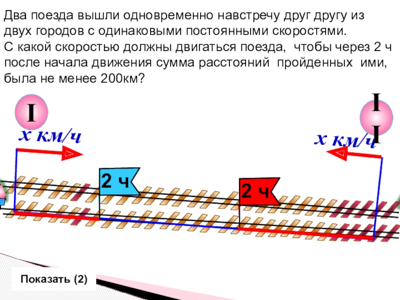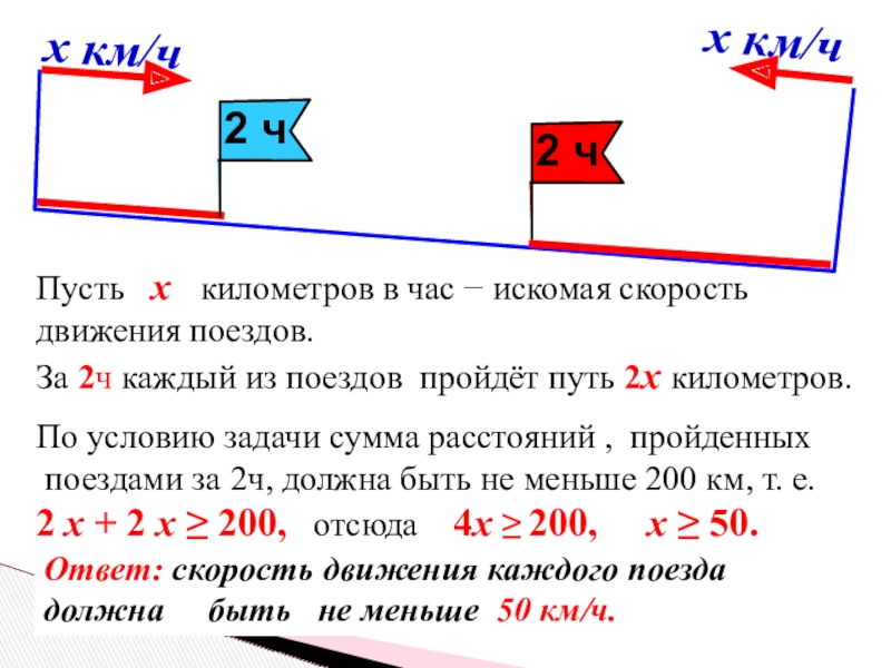 поездами за 2ч, должна быть не меньше 200 км, т. е.