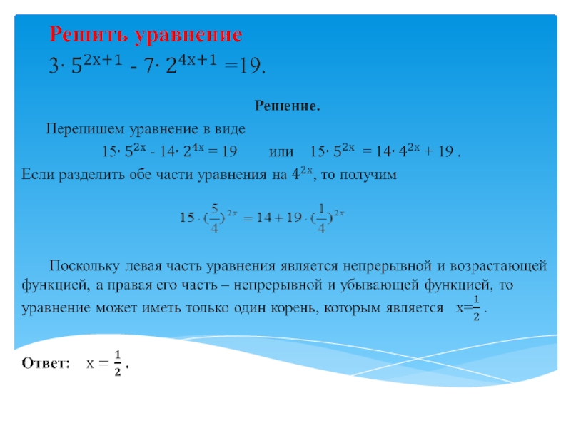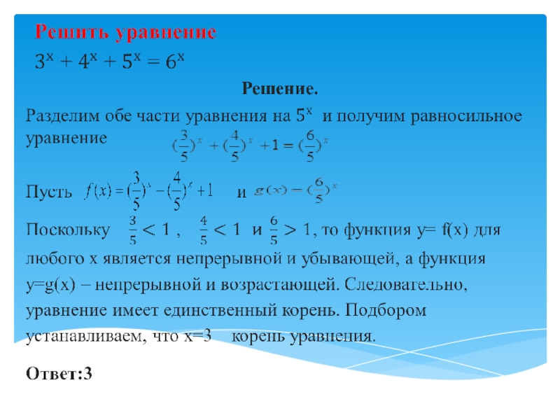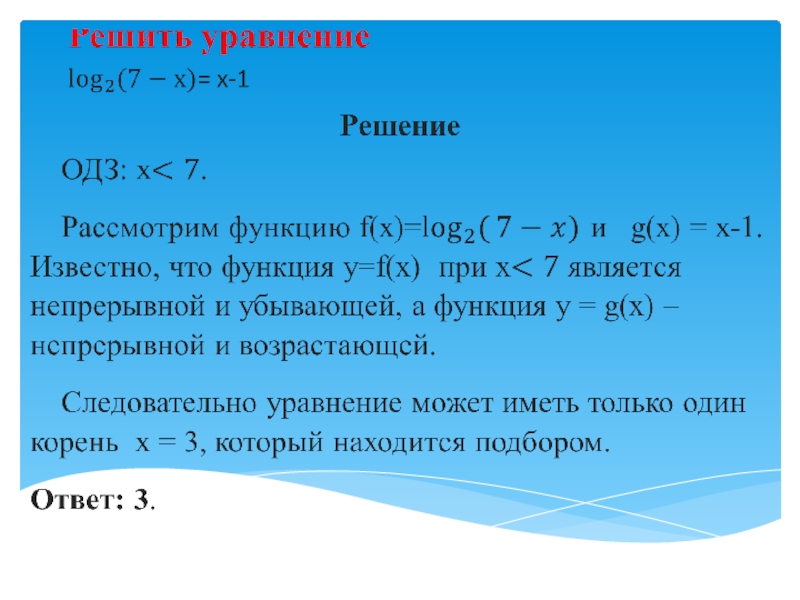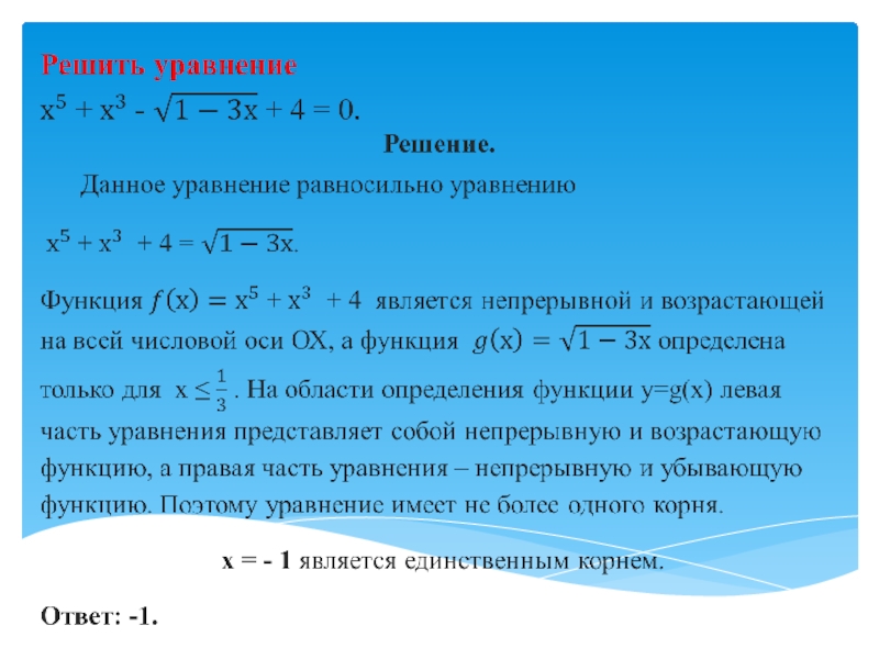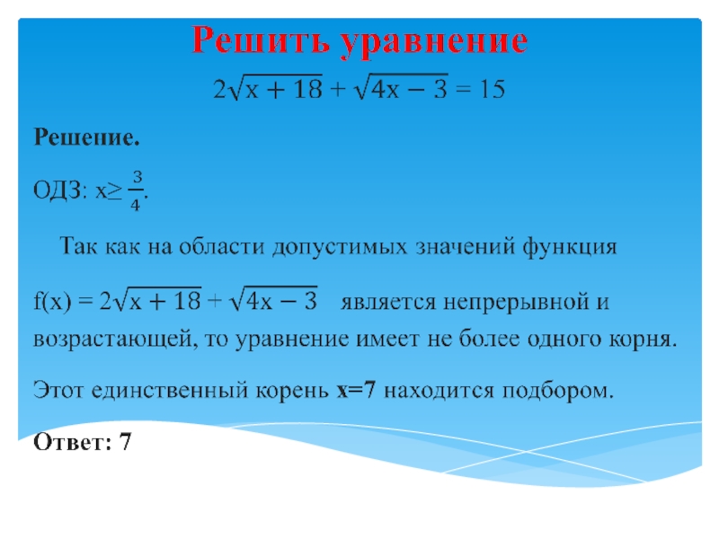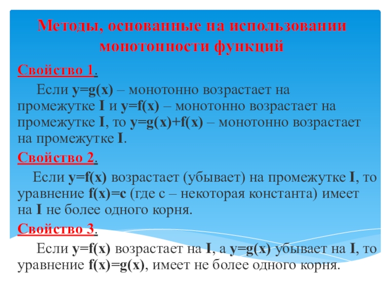 Методы, основанные на использовании монотонности функцийСвойство 1.  Если y=g(x) – монотонно возрастает на промежутке I и y=f(x) – монотонно возрастает на промежутке I, то y=g(x)+f(x) – монотонно возрастает на промежутке I.Свойство 2.  Если y=f(x) возрастает (убывает) на промежутке I, то уравнение f(x)=с (где с – некоторая константа) имеет