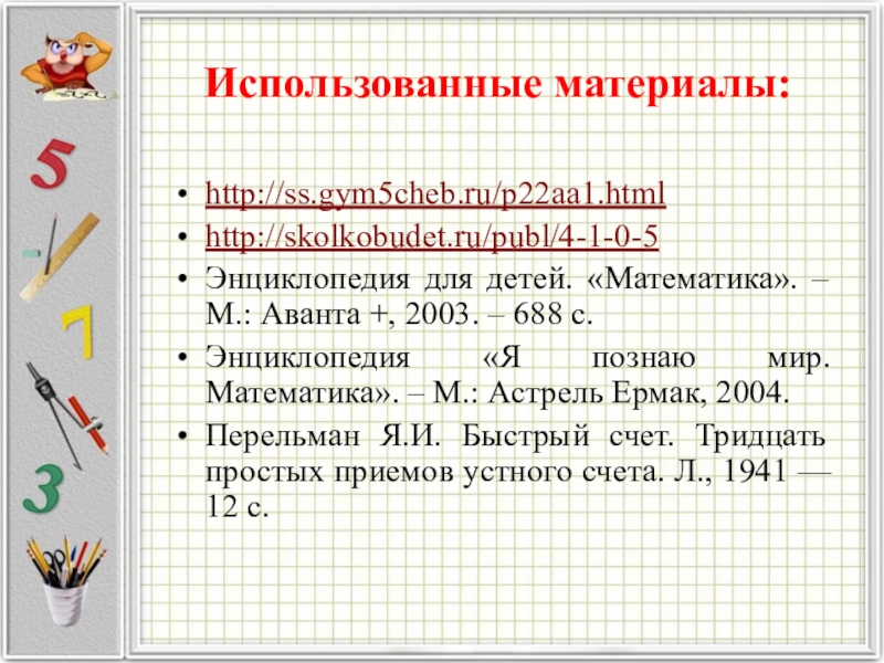 Энциклопедия «Я познаю мир. Математика». – М.: Астрель Ермак, 2004.