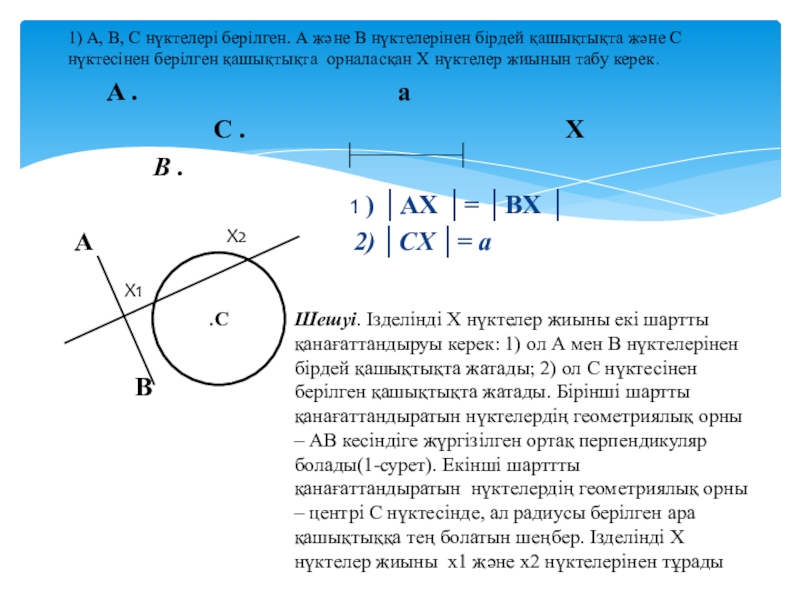 Шешуі. Ізделінді Х нүктелер жиыны екі шартты қанағаттандыруы керек: 1) ол А мен В нүктелерінен бірдей қашықтықта жатады; 2) ол С нүктесінен берілген қашықтықта жатады. Бірінші шартты қанағаттандыратын нүктелердің геометриялық орны – АВ кесіндіге жүргізілген ортақ перпендикуляр болады(1-сурет). Екінші шарттты қанағаттандыратын нүктелердің геометриялық орны – центрі С нүктесінде, ал радиусы берілген ара қашықтыққа тең болатын шеңбер. Ізделінді Х нүктелер жиыны х1 және х2 нүктелерінен тұрады
