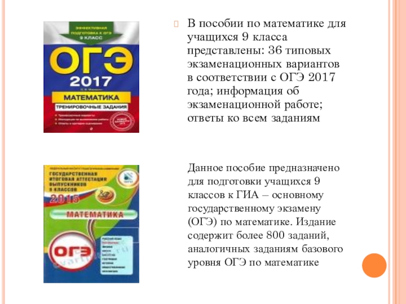 Данное пособие предназначено для подготовки учащихся 9 классов к ГИА – основному государственному экзамену (ОГЭ) по математике. Издание содержит более 800 заданий, аналогичных заданиям базового уровня ОГЭ по математике