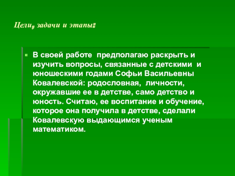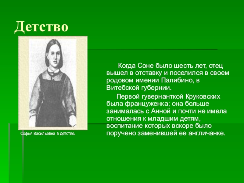 связанные с детскими и юношескими годами Софьи Васильевны Ковалевской: родословная, личности, окружавшие ее в детстве, само детство и юность. Считаю, ее воспитание и обучение, которое она получила в детстве, сделали Ковалевскую выдающимся ученым математиком.