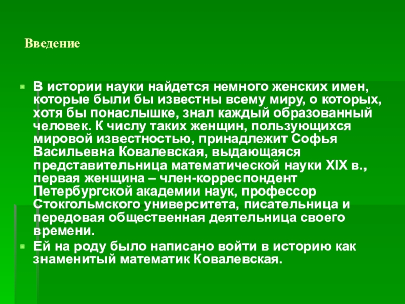 всему миру, о которых, хотя бы понаслышке, знал каждый образованный человек. К числу таких женщин, пользующихся мировой известностью, принадлежит Софья Васильевна Ковалевская, выдающаяся представительница математической науки XIX в., первая женщина – член-корреспондент Петербургской академии наук, профессор Стокгольмского университета, писательница и передовая общественная деятельница своего времени.