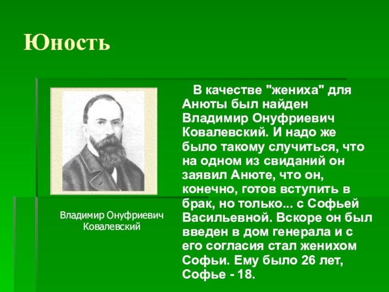 Владимир Онуфриевич Ковалевский. И надо же было такому случиться, что на одном из свиданий он заявил Анюте, что он, конечно, готов вступить в брак, но только... с Софьей Васильевной. Вскоре он был введен в дом генерала и с его согласия стал женихом Софьи. Ему было 26 лет, Софье - 18.