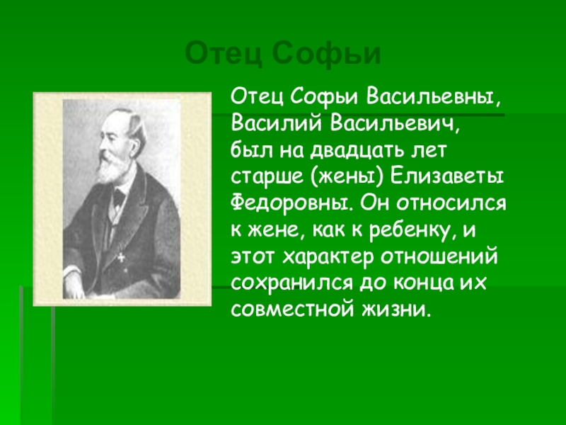 Отец Софьи Васильевны, Василий Васильевич, был на двадцать лет старше