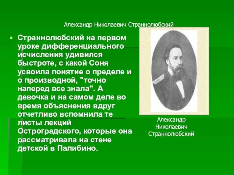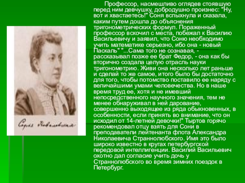 ним девчушку, добродушно произнес: "Ну, вот и хвастаетесь!" Соня вспыхнула и сказала, каким путем дошла до объяснения тригонометрических формул. Пораженный профессор вскочил с места, побежал к Василию Васильевичу и заявил, что Соню необходимо учить математике серьезно, ибо она - новый Паскаль" "...Сама того не сознавая, - рассказывал позже ее брат Федор, - она как бы вторично создала целую отрасль науки тригонометрию. Живи она несколько лет раньше и сделай то же самое, итого было бы достаточно для того, чтобы потомство поставило ее наряду с величайшими умами человечества. Но в наше время труд ее, хотя и не имевший непосредственного научного значения, тем не менее обнаруживал в ней дарование, совершенно выходящее из ряда обыкновенных, в особенности, если принять во внимание, что он исходил от 14-летней девочки!" Тыртов горячо рекомендовал отцу взять для Сони в преподаватели лейтенанта флота Александра Николаевича Страннолюбского. Имя это было широко известно в кругах петербургской передовой интеллигенции. Василий Васильевич охотно дал согласие учить дочь у Страннолюбского во время зимних поездок в Петербург.