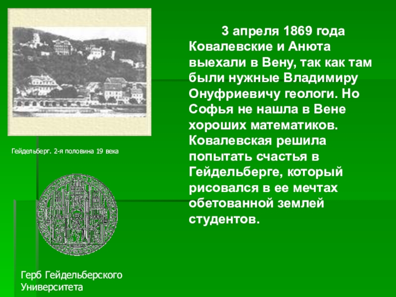 3 апреля 1869 года Ковалевские и Анюта выехали в Вену, так как там были нужные Владимиру Онуфриевичу геологи. Но Софья не нашла в Вене хороших математиков. Ковалевская решила попытать счастья в Гейдельберге, который рисовался в ее мечтах обетованной землей студентов.
