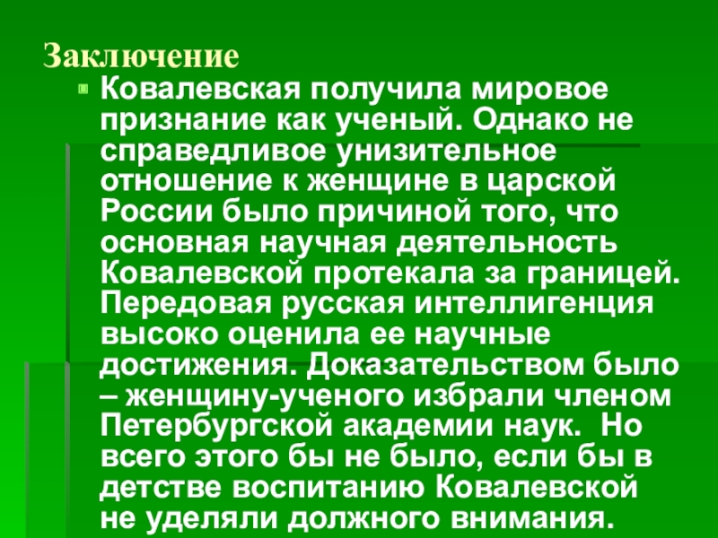 отношение к женщине в царской России было причиной того, что основная научная деятельность Ковалевской протекала за границей. Передовая русская интеллигенция высоко оценила ее научные достижения. Доказательством было – женщину-ученого избрали членом Петербургской академии наук. Но всего этого бы не было, если бы в детстве воспитанию Ковалевской не уделяли должного внимания.