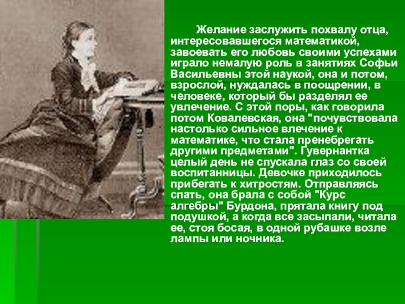 математикой, завоевать его любовь своими успехами играло немалую роль в занятиях Софьи Васильевны этой наукой, она и потом, взрослой, нуждалась в поощрении, в человеке, который бы разделял ее увлечение. С этой поры, как говорила потом Ковалевская, она "почувствовала настолько сильное влечение к математике, что стала пренебрегать другими предметами". Гувернантка целый день не спускала глаз со своей воспитанницы. Девочке приходилось прибегать к хитростям. Отправляясь спать, она брала с собой "Курс алгебры" Бурдона, прятала книгу под подушкой, а когда все засыпали, читала ее, стоя босая, в одной рубашке возле лампы или ночника.