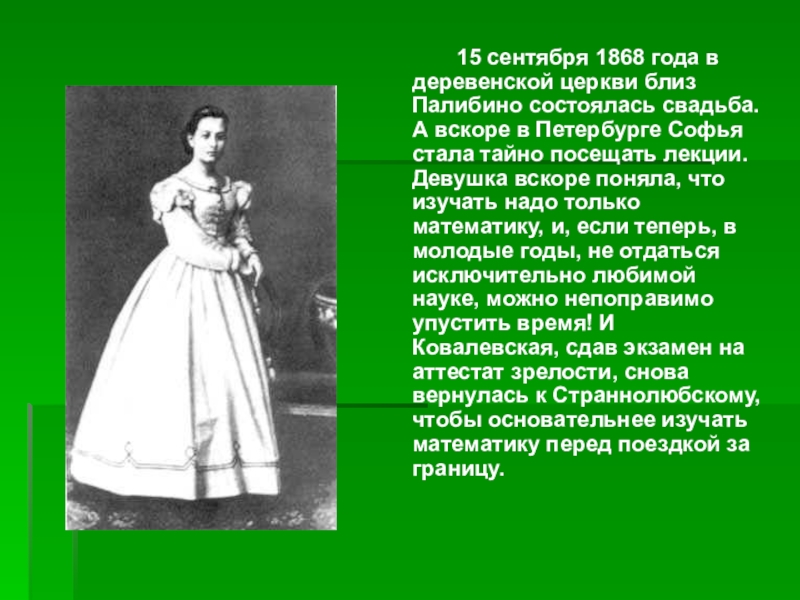 деревенской церкви близ Палибино состоялась свадьба. А вскоре в Петербурге Софья стала тайно посещать лекции. Девушка вскоре поняла, что изучать надо только математику, и, если теперь, в молодые годы, не отдаться исключительно любимой науке, можно непоправимо упустить время! И Ковалевская, сдав экзамен на аттестат зрелости, снова вернулась к Страннолюбскому, чтобы основательнее изучать математику перед поездкой за границу.
