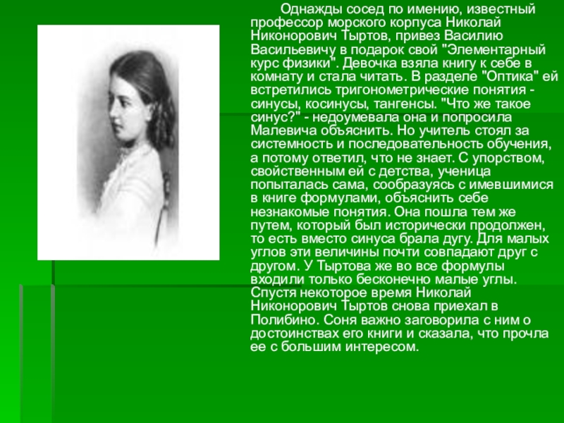 известный профессор морского корпуса Николай Никонорович Тыртов, привез Василию Васильевичу в подарок свой "Элементарный курс физики". Девочка взяла книгу к себе в комнату и стала читать. В разделе "Оптика" ей встретились тригонометрические понятия - синусы, косинусы, тангенсы. "Что же такое синус?" - недоумевала она и попросила Малевича объяснить. Но учитель стоял за системность и последовательность обучения, а потому ответил, что не знает. С упорством, свойственным ей с детства, ученица попыталась сама, сообразуясь с имевшимися в книге формулами, объяснить себе незнакомые понятия. Она пошла тем же путем, который был исторически продолжен, то есть вместо синуса брала дугу. Для малых углов эти величины почти совпадают друг с другом. У Тыртова же во все формулы входили только бесконечно малые углы. Спустя некоторое время Николай Никонорович Тыртов снова приехал в Полибино. Соня важно заговорила с ним о достоинствах его книги и сказала, что прочла ее с большим интересом.