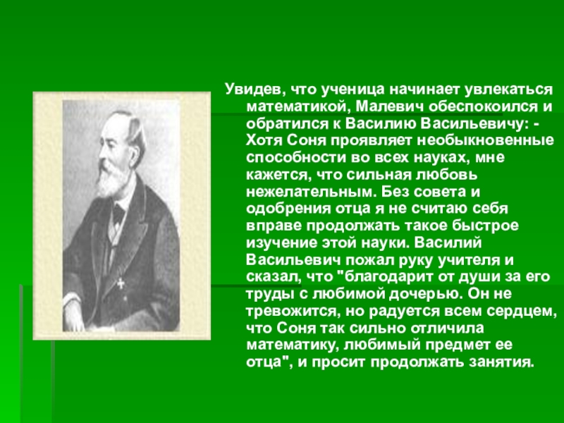 Василию Васильевичу: - Хотя Соня проявляет необыкновенные способности во всех науках, мне кажется, что сильная любовь нежелательным. Без совета и одобрения отца я не считаю себя вправе продолжать такое быстрое изучение этой науки. Василий Васильевич пожал руку учителя и сказал, что "благодарит от души за его труды с любимой дочерью. Он не тревожится, но радуется всем сердцем, что Соня так сильно отличила математику, любимый предмет ее отца", и просит продолжать занятия.