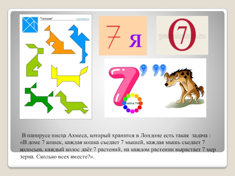 «В доме 7 кошек, каждая кошка съедает 7 мышей, каждая мышь съедает 7 колосьев, каждый колос даёт 7 растений, на каждом растении вырастает 7 мер зерна. Сколько всех вместе?».