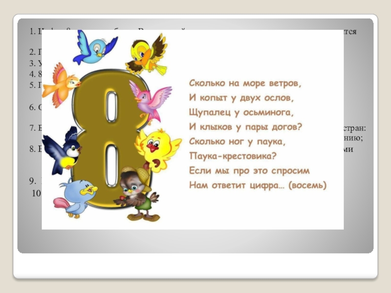 Слайд 231. Цифра 8 похожа на букву В, с которой она начинается;