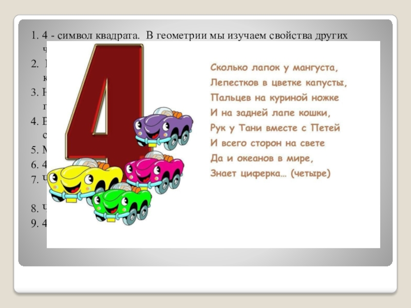 4. В древности 4 считали символом устойчивости и прочности (стол и стул на 4 ногах);