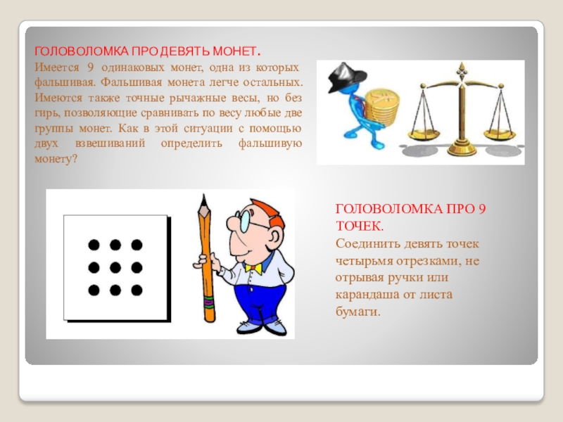 Слайд 26ГОЛОВОЛОМКА ПРО ДЕВЯТЬ МОНЕТ.