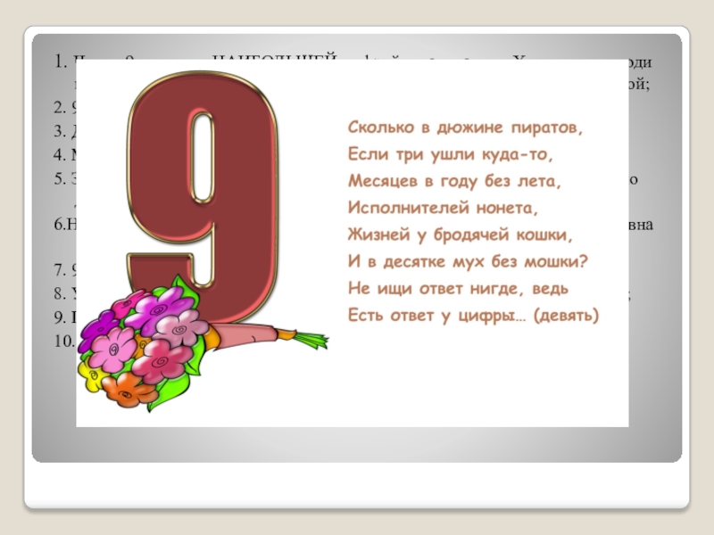 9. В пословицах и поговорках под семеркой подразумевается «много»: 7 футов под килем, седьмая вода на киселе, 7 раз отмерь и т.д.