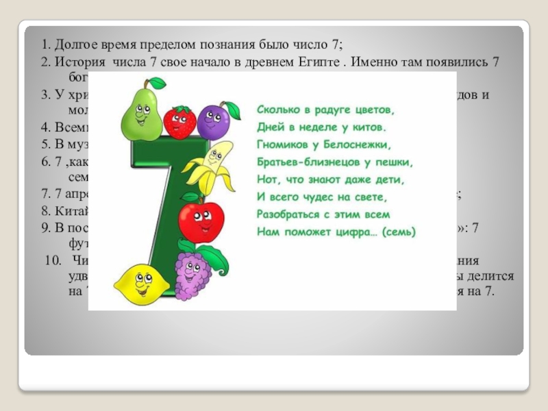 6. 7 ,как и 3, сказочное число : «Белоснежка и 7 гномов», «Цветик – семицветик», «7 Семионов» и т. д.;