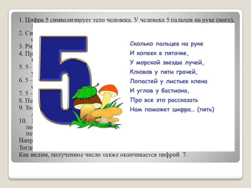 Слайд 171. Цифра 5 символизирует тело человека. У человека 5 пальцев на