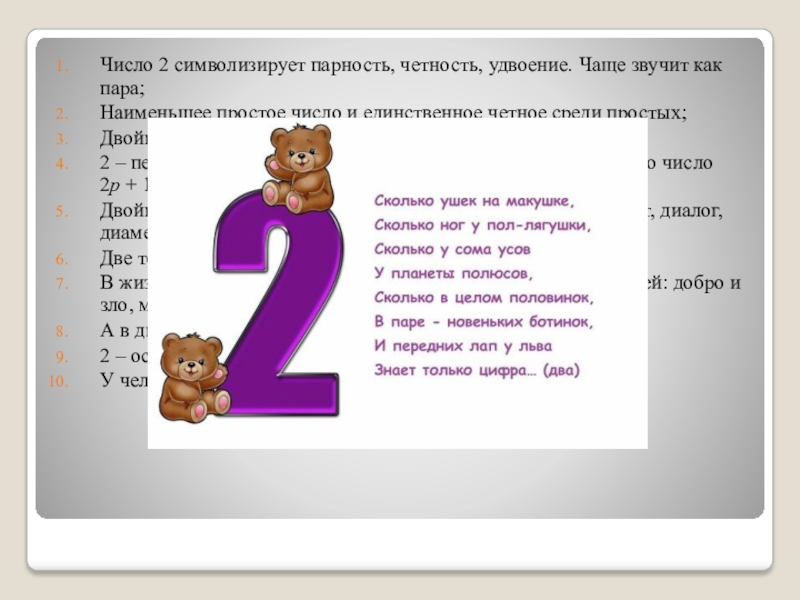 Слайд 10Число 2 символизирует парность, четность, удвоение. Чаще звучит как пара;