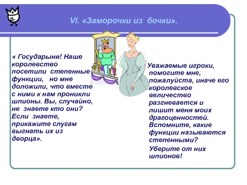 « Уважаемые игроки, помогите мне, пожалуйста, иначе его королевское величество разгневается и лишит меня моих драгоценностей. Вспомните, какие функции называются степенными?