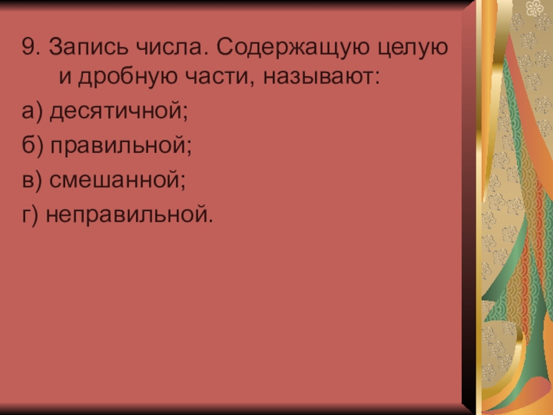 9. Запись числа. Содержащую целую и дробную части, называют:а) десятичной;	б) правильной;	в) смешанной;г) неправильной.