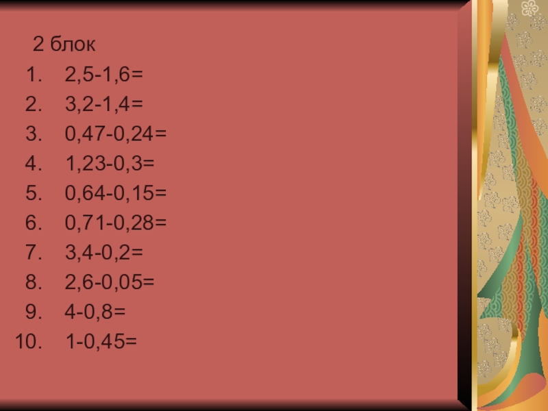 2 блок2,5-1,6=3,2-1,4=0,47-0,24=1,23-0,3=0,64-0,15=0,71-0,28=3,4-0,2=2,6-0,05=4-0,8=1-0,45=